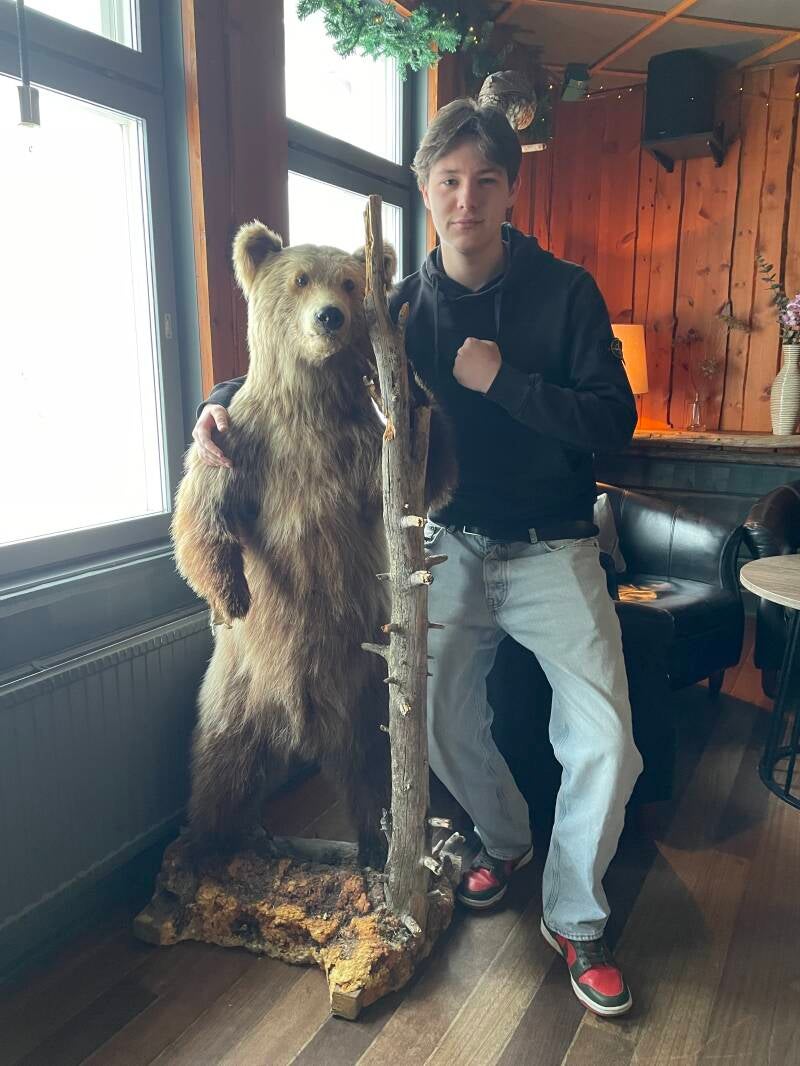In het hotel kwam Brent ook nog een opgezette bruine beer tegen. Hij had hem wel groter verwacht zei hij!