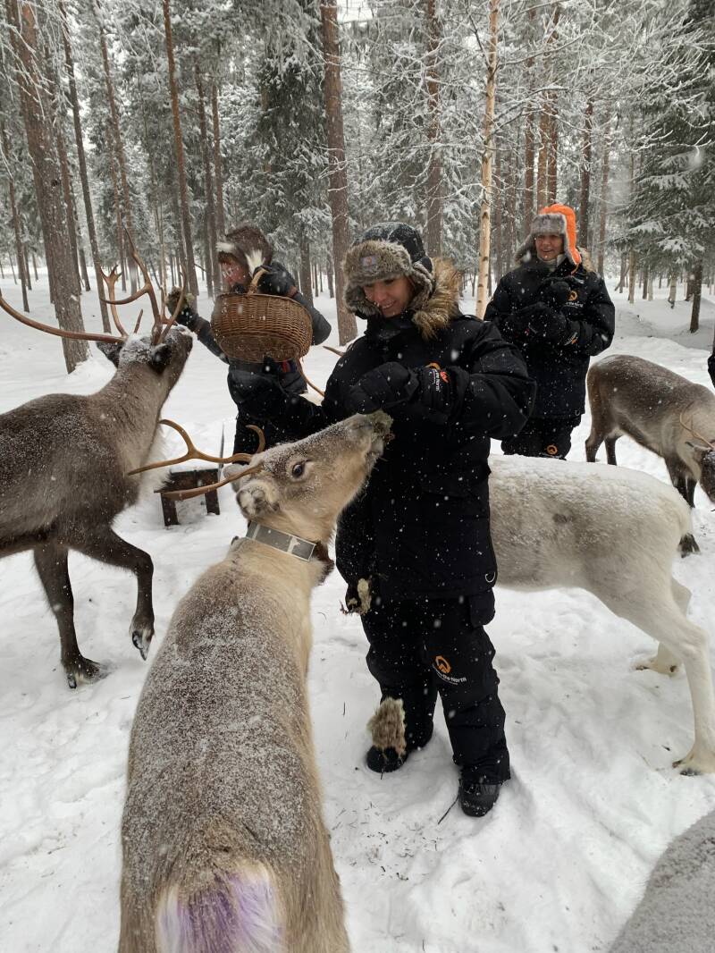 Na het hele verhaal zijn we de rendieren gaan voederen met gedroogd mos. Heel leuk om te doen. We mochten ze aaien en ermee op de foto. Wat opviel was de diepe vacht. Je kon je vingers er bijna helemaal insteken. Zo kunnen ze tot -70° overleven!