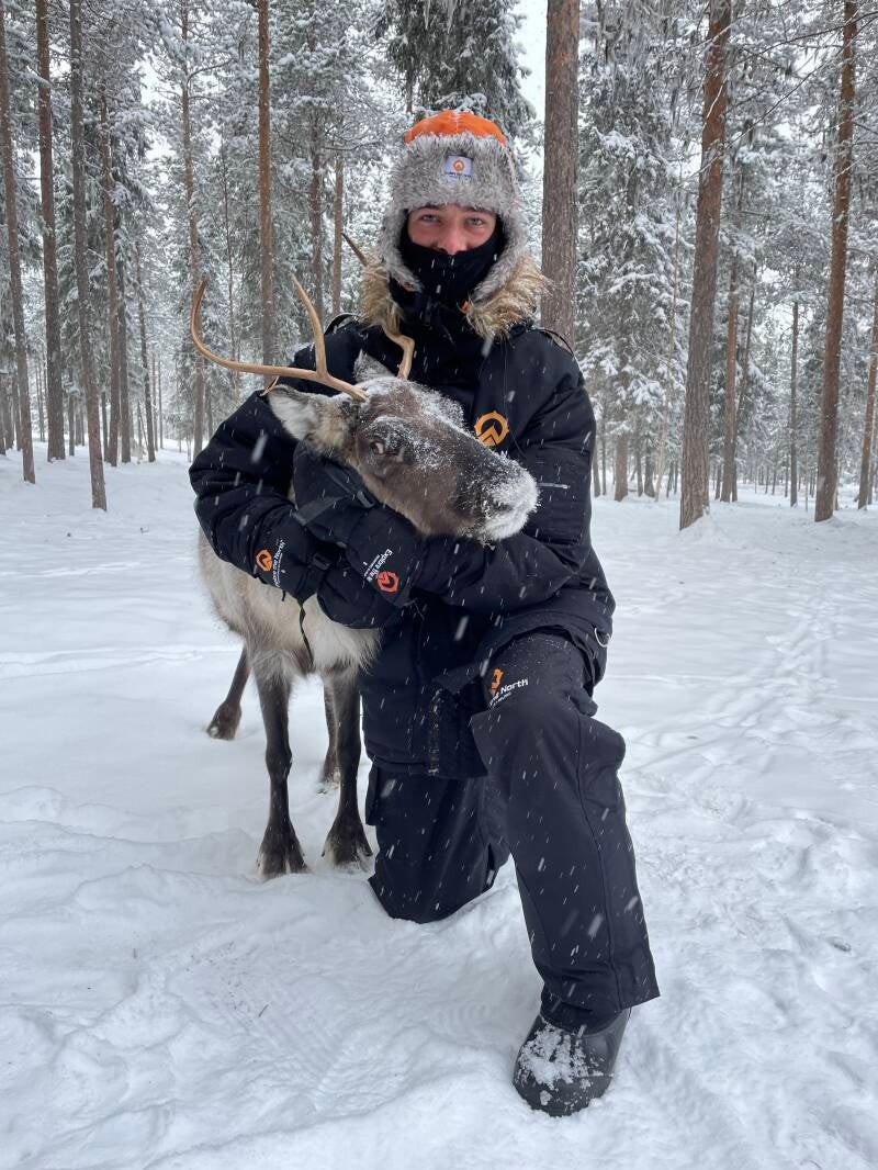 En toen kwam er een local af die volledig uitgedost was in een zwaar pak met muts en een echte vikingbaard. Toen had ik al in het snuitje dat het niet met de bus ging zijn. En hij riep: reindeer!
