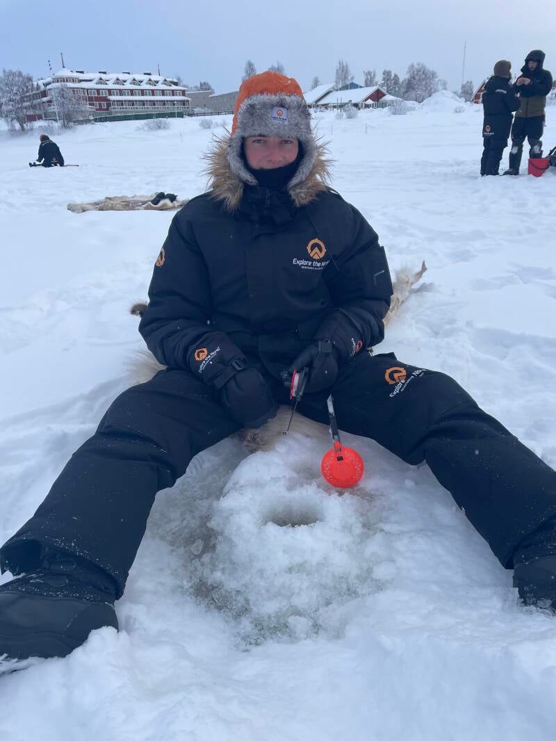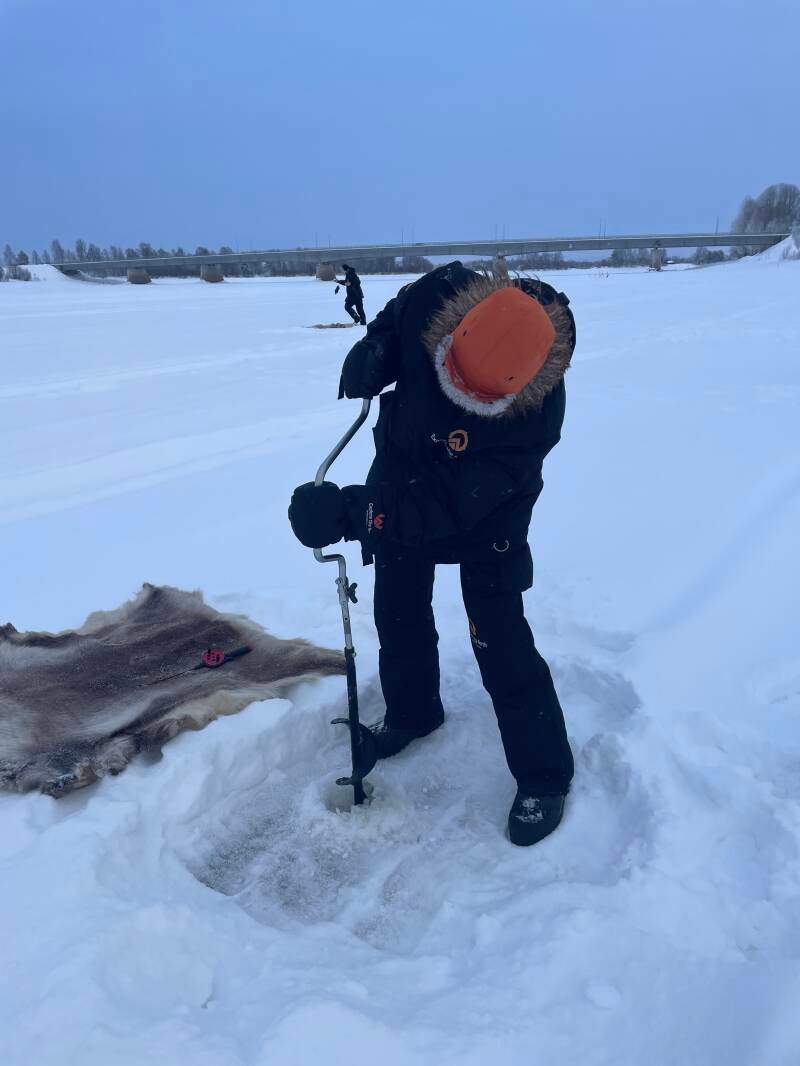 De gids gaf ons eerst wat instructies en maakte het eerste gat met een boor in het ijs. Het ijs was pakweg 30 tot 40 cm. Maar dit komt vooral omdat er onder het ijs nog stromend water is waardoor het niet zo dik wordt.