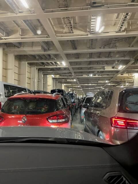 Om 15h mochten we richting de boot rijden, maar echt eerlijk verliep het inchecken niet. Er waren pakweg 5 lanes en om de beurt mochten er ongeveer 10 wagens de boot op, maar onze rij werd telkens overgeslagen, waardoor we er ongeveer een uur in gestaan hebben. Uiteindelijk mochten we toch op de boot rijden om dan met millimeter werk naast elkaar te parkeren.