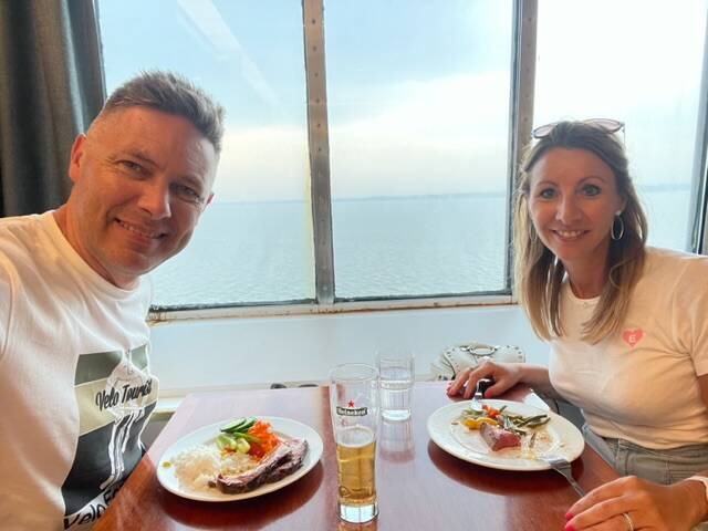 Eerst hebben we even bekomen met een drankje op het dek, want het was 34 graden.
