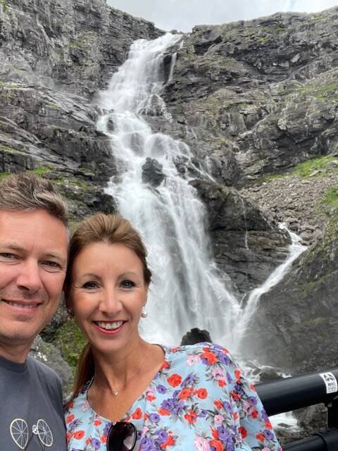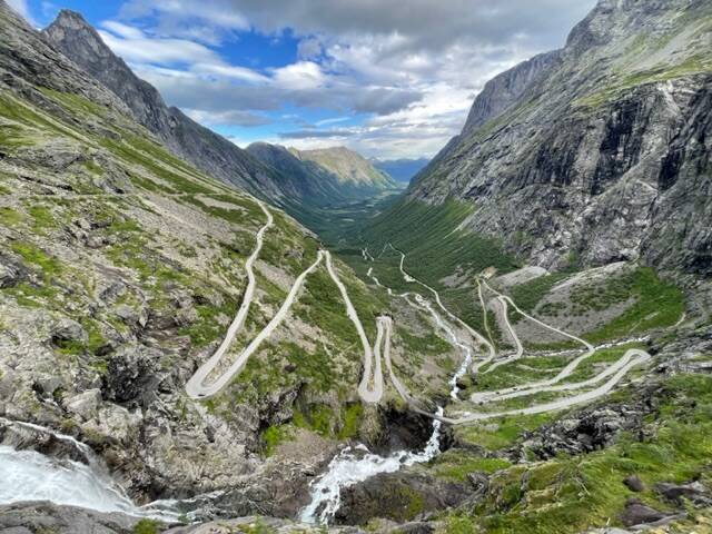 Als we aan de klim begonnen was het echt aan 10% stijging zigzaggen van links naar rechts. Omdat we zo vroeg waren was het nog niet heel druk alhoewel er toch al wel wat volk naar boven reed. En in de verte zagen we dan de gigantische waterval die van de Trolligsten rots naar beneden donderde. Ik heb er een heel kort filmpje van gemaakt en ook heel korte even rond gedraaid om het zicht te tonen: