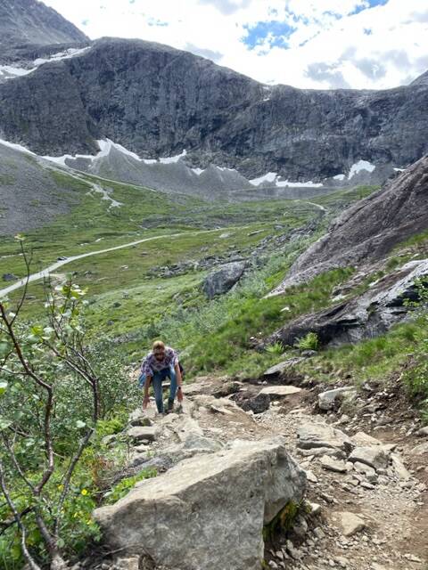 Toen we omhoog keken zagen we kleine stipjes van mensen die al naar boven aan het wandelen waren. Nu is wandelende wel een groot woord, want eigenlijk moet je ook hier wel op rotsblokken klimmen. Soms zijn er kettingen gespannen zodat je toch enige houvast hebt maar het is niet voor mensen die niet goed te been zijn, en je mag je ook niet te hard focussen op de diepte naast je. Kelly kreeg op een gegeven moment wel een klein paniekske, maar toen ze even gezeten had zijn we samen op't gemak naar boven gewandeld. Zelfs een Noorse dame met een 3-jarige peuter en een baby op haar rug ging hier naar boven. Da's toch wel de moeite als je dat ziet want evident was het niet.