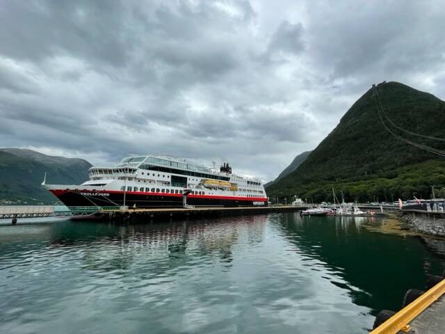 Maar toen we ons klaarmaakten voor het ontbijt kwam er een volgende boot aan. En toen we goed keken bleek dit de Hertigruten te zijn! Oh! Wat een herinnering, of 't is te zeggen: had een herinnering moeten worden. Voor de mensen die ons iets beter kennen, die weten dat we de Hertigruten tocht geboekt hadden via de reisorganisatie Nordic in 2019. En toen kwam Corona. Eerst werd alles uitgesteld, en dan nog eens, en finaal is alles geannuleerd. En ja, na 2 jaar hebben we dan beslist om zelf een tocht te organiseren, maar die is toen terug in't water gevallen wegens omstandigheden waarbij we dan naar Denemarken geweest zijn (waar ik absoluut geen spijt van heb!).