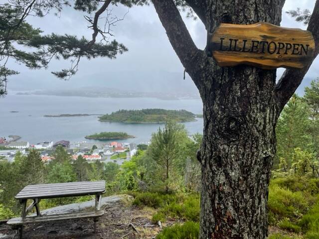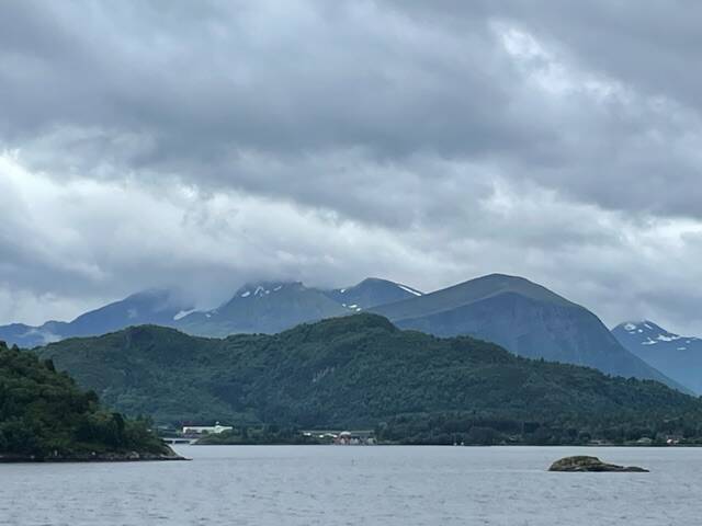 We reden Ålesund door en via een kleine brug zijn we dan op een eiland gekomen, met in het midden een gigantische rots. Onze route heeft ons daar helemaal rond gebracht en gaf ons een mooi zicht op de omliggende fjorden en het stadje. Op dat eilandje hebben we in een buskotje terwijl het even regende onze lunch opgegeten.