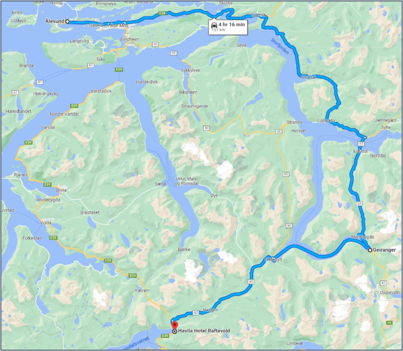 We vertrokken vanuit ons hotel onder Ålesund en hadden 2 keuzes. Ofwel de veerboot vlak aan ons hotel nemen en recht naar het zuiden richting Hornindal. Dat zou maar 85km zijn. De andere optie was een ommetje maken van 100km om langs de Geiranger fjord te rijden. Maar Geiranger - sinds 2005 op de Werelderfgoedlijst van UNESCO -wilden we absoluut zien. Dus de keuze was snel gemaakt.