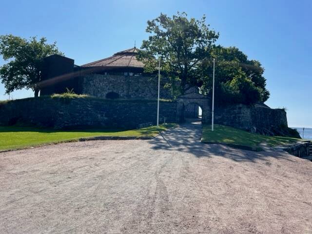 We zijn na ons ontbijt gaan uit checken, en alles in de wagen gaan steken van bagage. Daarna hebben we nog wat rondgewandeld in Kristiansand. We waren hier maar gewoon doorgereden bij de aankomst maar hadden nu even tijd om door het stadje en de haven te wandelen. En ik moet zeggen dat het echt heel leuk is hier. Heel mooie haven met een klein strandje vlak bij het stadscentrum. En een klein fort met oude kanonnen die gericht zijn richting het water.
